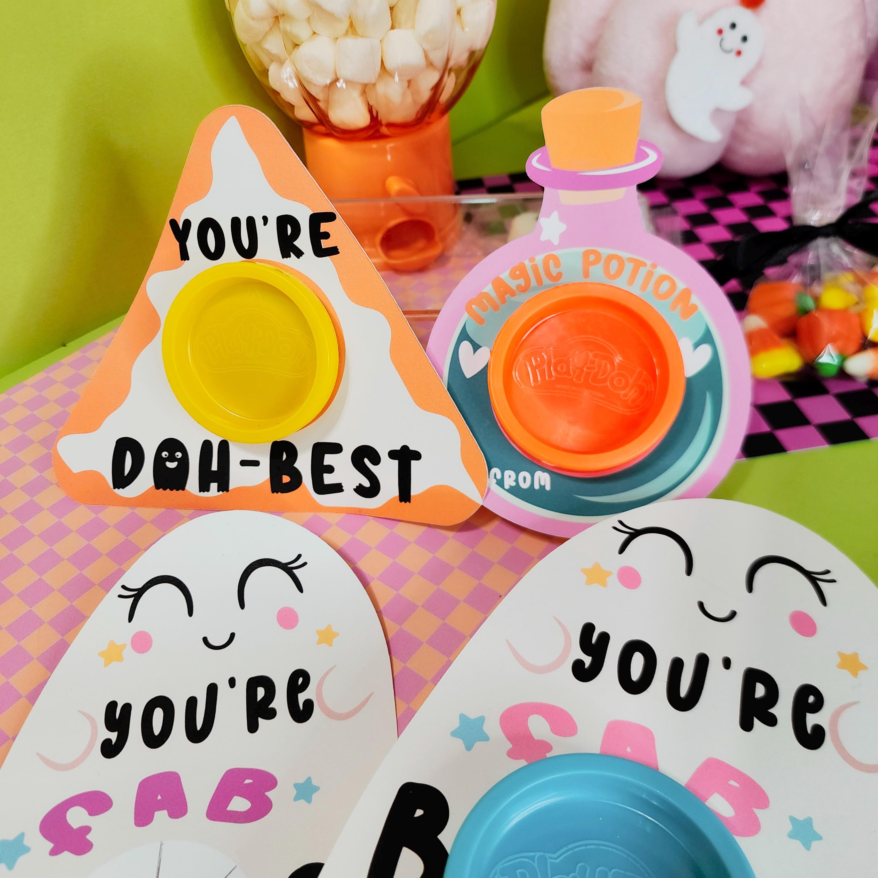 Celebrate Halloween in a fun and thoughtful way with these printable Halloween play doh holders, perfect for adding a festive touch to your party decor. Designed as delightful non-candy gifts for kids, they make excellent classroom favors that children can share with friends. Crafted to fit mini Play-Doh tubs, these holders bring a playful and colorful vibe to any Halloween celebration.